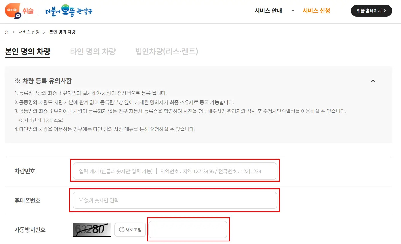 ※ 외지 차량도 신청 가능하지만, 차량번호와 연락처가 정확히 등록되어 있어야 합니다.